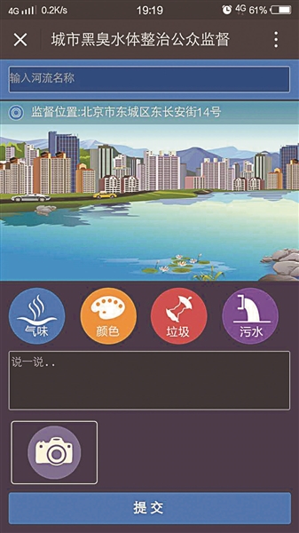 The WeChat WeChat official account "Public Participation in Urban Water Environment" jointly established by the Ministry of Environmental Protection and the Ministry of Housing and Urban-Rural Development not only has the function of monitoring and reporting black and odorous water bodies, but also can automatically locate them through WeChat, and the staff can quickly conduct on-site investigation according to the reported location.